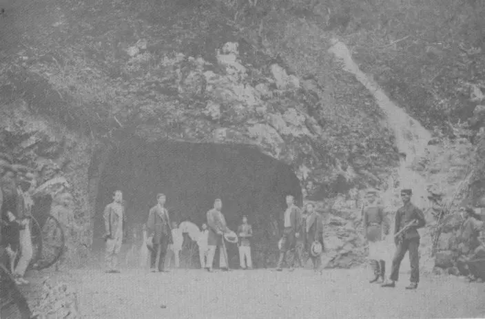 上の写真は、栗子山隧道の山形(西側)の入り口の前で、工事中に視察する三島やオランダ人技師エッセル(G.A.Escher)をとらえているが、トンネル内をよくよく覗きこむと、馬車が停まっているのが見える。あるいは彼らが乗ってきた馬車だろうか、トンネルの左側にもわずかに馬車の車輪が写り込んでいる。