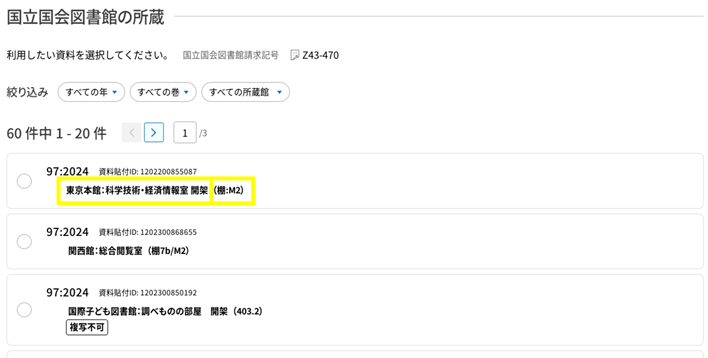 国立国会図書館サーチの資料詳細画面の下部にある「国立国会図書館の所蔵」で、「東京本館:科学技術・経済情報室 開架」または「東京本館:科学技術・経済情報室 書庫」と表示されている資料は、科学技術・経済情報室で閲覧できます。