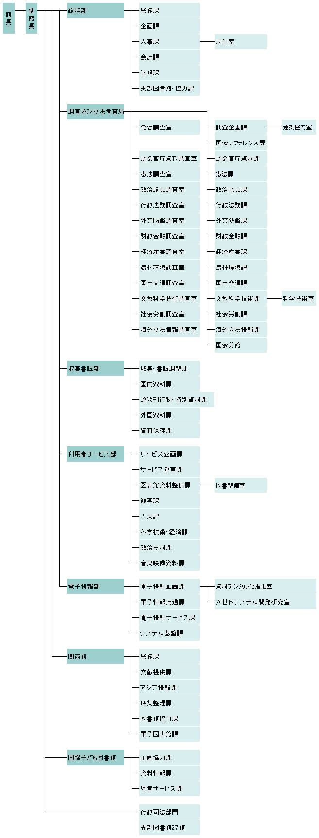 ホーム国立国会図書館について国立国会図書館組織図国立国会図書館組織図組織図に関する説明(txt: 2KB)国立国会図書館について使命・役割ビジョン館長挨拶国立国会図書館の概要沿革建物と設備組織・職員・予算統計パンフレット一覧関係法規方針活動実績評価利用者アンケート