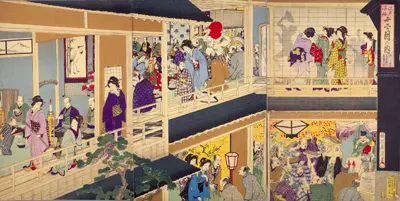 The trees in Kannazuki are beginning to change color, signaling the arrival of the beautiful autumn season with its vibrant leaves. People went out to enjoy the autumn leaves. In Kamigata (Kansai region), Tsutenkyo Bridge and Takao in Kyoto as well as Tatsuta River in Nara, are renowned for their autumn foliage. Meanwhile, in Edo (Tokyo), Kaian-ji Temple in Shinagawa and Takinogawa River in Oji are popular spots for viewing autumn foliage.
