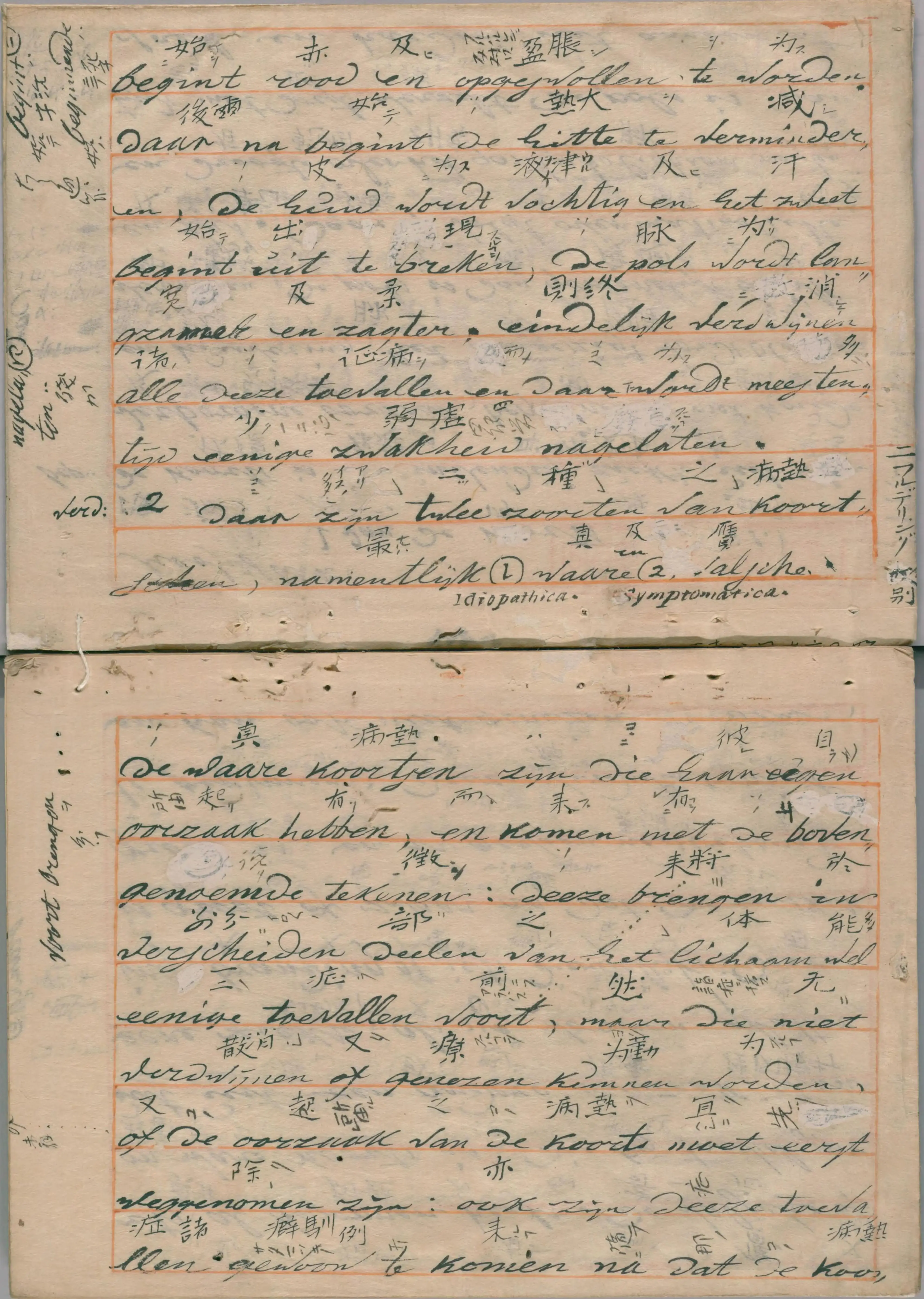 Genzui translated the book of internal medicine by Johannes de Gorter (Gezuiverde geneeskonst, of kort onderwys der meeste inwendige ziekten, Amsterdam, 1744) and published it under the title of Seisetsu naika sen'yo from 1793 to 1808. The inserted material is the draft of the book. The original book was owned by Katsuragawa Hoshu. Genzui utilized the Japanese style ruled paper bound in Japanese style, using it sideways in order to write both the original Dutch manuscript and the translated text on the same page. Corrections made with chalk are visible in some parts, showing the efforts he had made in the process of translation, especially when compared to the printed book (see also Kotenseki Sogo Database, the Waseda University Library (bunko08 C0026)). Moreover, the printed version was revised and augmented later by Udagawa Genshin and Fujii Hotei, making the sentences even easier to understand.