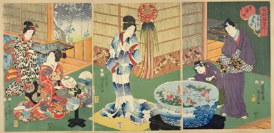 錦絵の世界でも、夏の風物詩として金魚が描かれたものが出回るようになります。江戸時代には大きなガラスの水槽はなかったため、陶器の鉢で金魚を飼いました。そのため、金魚は横からではなく、真上から眺める「上見」が普通でした。