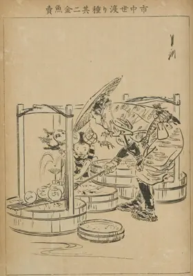 江戸時代になっても、初期の頃は豪商や大名・貴族等の観賞用でしたが、中期頃には金魚の養殖がおこなわれるようになり価格も安くなりました。寛延元(1748)年には金魚の手引書『金魚養玩草』が発行され、徐々に庶民にも金魚が普及するようになります。金魚ブームは文化文政時代(1804~1830年)にピークを迎えました。この頃には金魚を行商する金魚売りや、金魚すくいも始まっていたようで、夏が近づいたことを知らせる江戸の町の風物詩でした。画像では、金魚売りの様子と、店先に小さな丸いガラスの器の金魚玉を吊るして涼を取る人が描かれています。