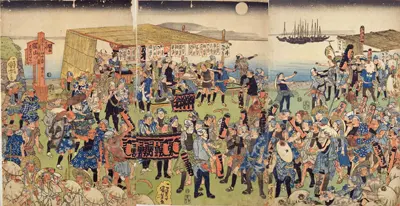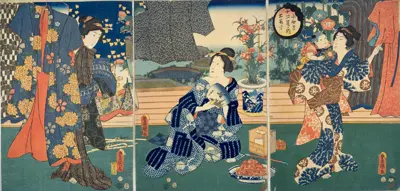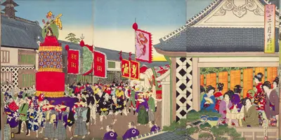 この時期は、夏の祭の時期でもあります。7日からは京都の祇園会(祇園祭)、15日には江戸の山王祭、その他にも住吉明神祭礼や赤坂氷川神社祭礼等の大祭が行われました。人々は身銭を切って山車に趣向を凝らし、仮装行列や練り物に念を入れました。
