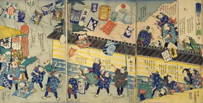 江戸の町には門付と呼ばれる芸人が訪れて、獅子舞・猿回し・太神楽・大黒舞・万歳などを披露しました。また外では凧あげや独楽遊び、羽根つき遊び等が行われ、大人も子どもも「ハレ」の日を楽しみました。
