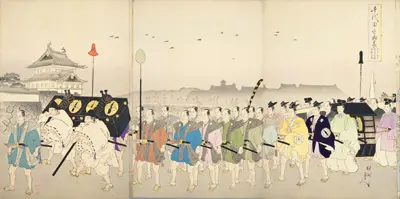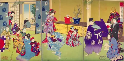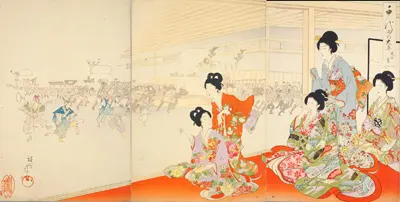 正月の行事として、武家では登城して新年の挨拶が行われました。新年行事として、初詣や愛宕山での強飯式、鏡開きなどが錦絵に描かれています。江戸城大奥でも新年の挨拶や鏡餅曳などの儀式が行われました。