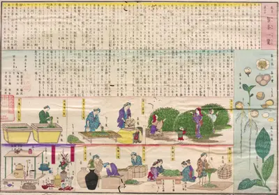 三重県四日市市水澤地区は鈴鹿山脈の麓に位置するお茶の産地です。『製茶説』では煎茶の製茶工程を描いています。老若男女が茶摘み作業をし、かまどで茶葉を蒸しています。蒸しあげた茶葉は焙炉で揉みながら乾燥させています。その後女性たちが箸で茶葉を選別しています。