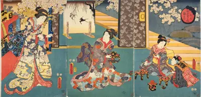 この頃から江戸は花見の季節を迎えます。江戸後期には町内や長屋をあげて並木桜の花見にでかけるようになりました。人々は花見用の衣装をまとい、春の一日を飲んで歌って賑わいました。錦絵にも花見の様子はたくさん描かれています。