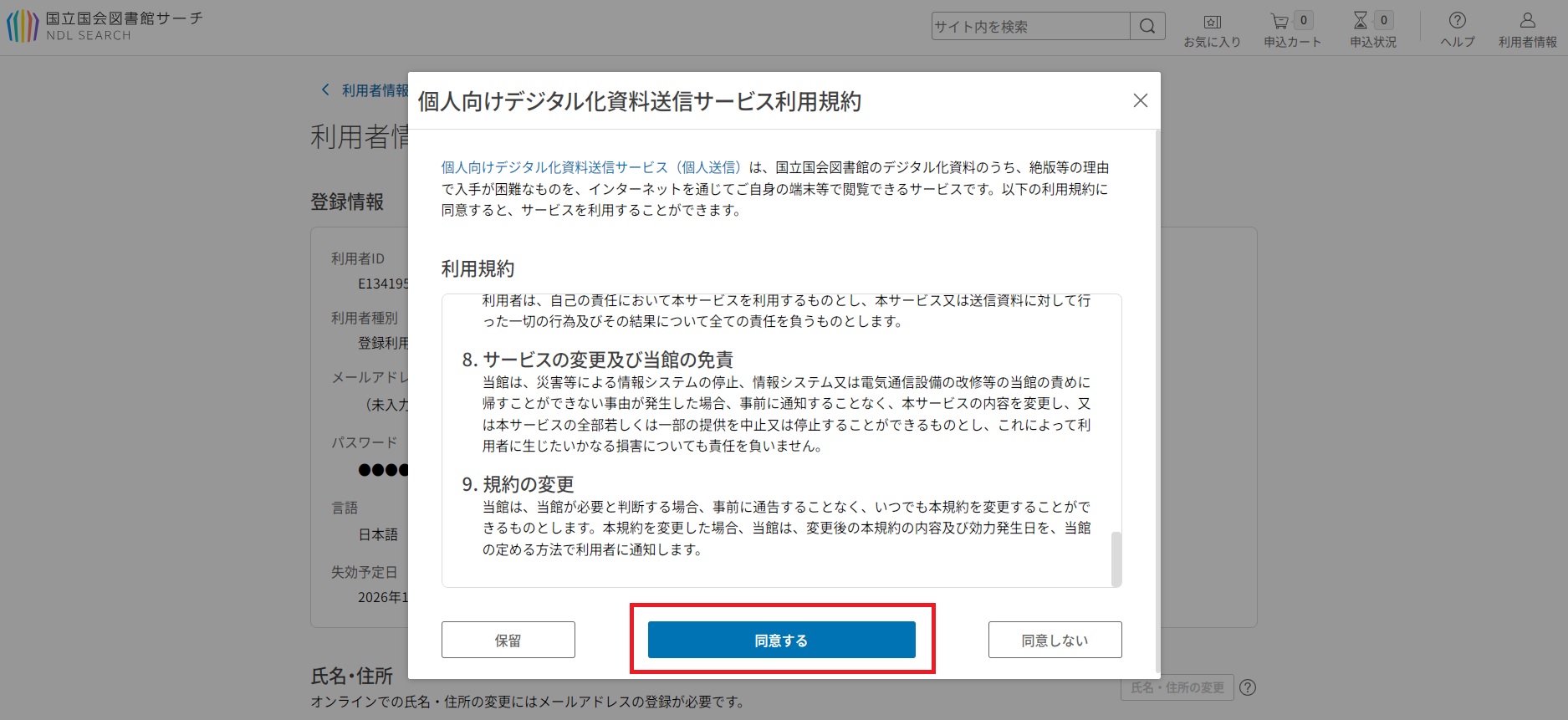このサービスの利用には、個人向けデジタル化資料送信サービス利用規約(2023年1月18日最終更新)(PDF: 194KB)への同意が必要です。下記のいずれかの方法で同意してください。一度利用規約に同意いただくと、次回以降は意思確認を経ずにサービスをご利用いただけます(利用規約の更新等が発生した場合を除く。)。