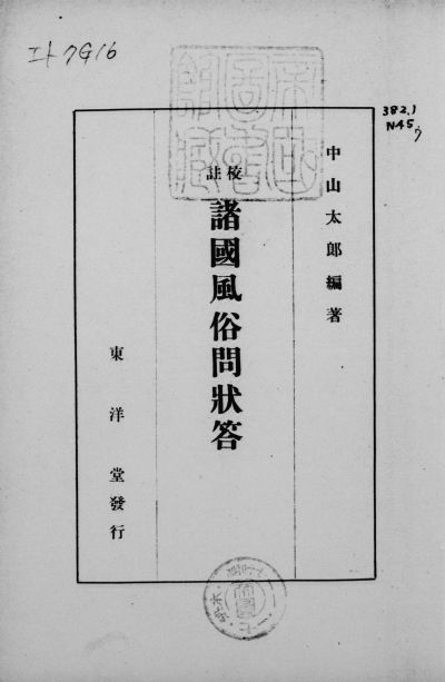 1) 中山太郎編『諸国風俗問状答 校注』東洋堂,昭和17【382.1-N45ウ】