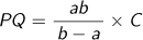 地点Mでの目盛a、地点Nでの目盛bを測定し、MNの距離Cを測定したとすると、△MPQと△BCEが相似であり、△NPQと△B’C’E’が相似であることを使って、PQの長さを計算で求めることができます。公式は