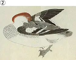 ここに示すミコアイサ(雌)の図4点は、体型が少し異なるものがあるものの、互いに酷似しています。というのも、これらはすべて高松藩主松平頼恭編『衆禽画譜』から転写・再転写を繰り返して描かれてきた図だからです。