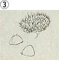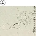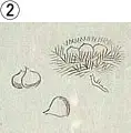 服部範忠著『薬圃図纂』(享保11(1726)年成)は、草木の形状に関する漢文表現を図を用いて説明した資料で、転写本として伝わっています。ここに示す4つの図はいずれもイガの箇所を転写したものですが、見比べて明らかなように転写の巧拙が甚だしく、③や④では描かれたものの正体がわからない程です。このように、転写者の技量により描かれた図に違いが生じることがあるので、転写本はできるだけ多くの資料を調べる必要があります。なお、①は書名が異なりますが、内容は②~④と同じです。