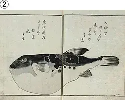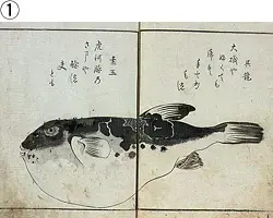 - ①鍬形蕙斎画。これが最初の版で、図には俳句と俳号が添えられており、俳句に魚名(虎河豚)が詠み込まれています。「宮津子」は召使の意です。