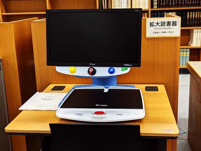 館内の各カウンターに拡大鏡、本館と新館の入退館カウンターとインフォメーションには電子ルーペを用意しています。使用をご希望の場合は、各カウンターにお申し出ください。